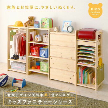 【商品名】北欧デザイン天然木低アレルゲンキッズファニチャーシリーズ■ランドセルラック【サイズ】外寸:(約)幅38 奥行35 高さ97cm内寸:〈ランドセル置き場〉(約)幅34 奥行32.5 高さ16cm〈引き出し〉(約)幅30.8cm 奥行24.5cm 5.65cm〈スライド棚部〉(約)幅33.8 奥行27.5cm〈中板〉(約)幅34 奥行32.5 高さ39〈下段オープン部〉(約)幅34cm 高さ33cm【重量】(約)10.5kg【カラー】ナチュラル、ホワイト【材質】パイン材(ラッカー塗装)プリント紙化粧繊維板・合板【耐荷重】棚板:各(約)5kg 引き出し:(約)3kg スライド棚:各(約)3kg フック:各(約)0.5kg【梱包サイズ/梱包重量】(約)100.9 38.4cm 13.1cm・11.9kg【生産国】ベトナム※お客様組立品■オープンラック【サイズ】外寸:(約)幅52.5 奥行35 高さ97cm内寸:(約)幅48.5cm 奥行32.5 可動棚:7ピッチ、13段階床からフック(下)までの高さ:49.5フック(下)からフック(上)までの高さ:44【重量】(約)9.5kg【カラー】ナチュラル、ホワイト【材質】パイン材(ラッカー塗装)【耐荷重】棚板:各(約)5kg フック:各(約)0.5kg【梱包サイズ/梱包重量】(約)100.4cm 38.4cm 10cm・10.4kg【生産国】ベトナム※お客様組立品■ハンガーラック【サイズ】外寸:(約)幅52.5 奥行35 高さ97cm内寸:(約)幅48.5cm 32.5 可動棚:7ピッチ、5段階底板からハンガーバーまでの高さ:(約)87cm床からフック(下)までの高さ:49.5フック(下)からフック(上)までの高さ:44【重量】本体:(約)8.5kg【カラー】ナチュラル、ホワイト【材質】パイン材(ラッカー塗装)【耐荷重】棚板:各(約)5kg ハンガーバー:(約)3kg フック:各(約)0.5kg【梱包サイズ/梱包重量】(約)100.4cm 38.4cm 10cm・9.5kg【生産国】ベトナム※お客様組立品■チェスト【サイズ】外寸:幅52.5 幅52.5 高さ90cm内寸:〈引き出し〉幅43.5 奥行27.4 高さ10.95cm 4段【重量】本体:(約)24kg【カラー】ナチュラル、ホワイト【材質】パイン材(ラッカー塗装)プリント紙化粧繊維板・合板【耐荷重】天板:(約)10kg 引出:各(約)3kg フック:各(約)0.5kg【梱包サイズ/梱包重量】(約)57.9cm 40.6cm 96.6cm・26.5kg【生産国】ベトナム※完成品(フック、クッションはお客様取付)【天然木の特徴(必ずお読みください)】1.木材自体が持っている節、黒い木目のライン、青色の筋状の模様などが入っている部分があります。